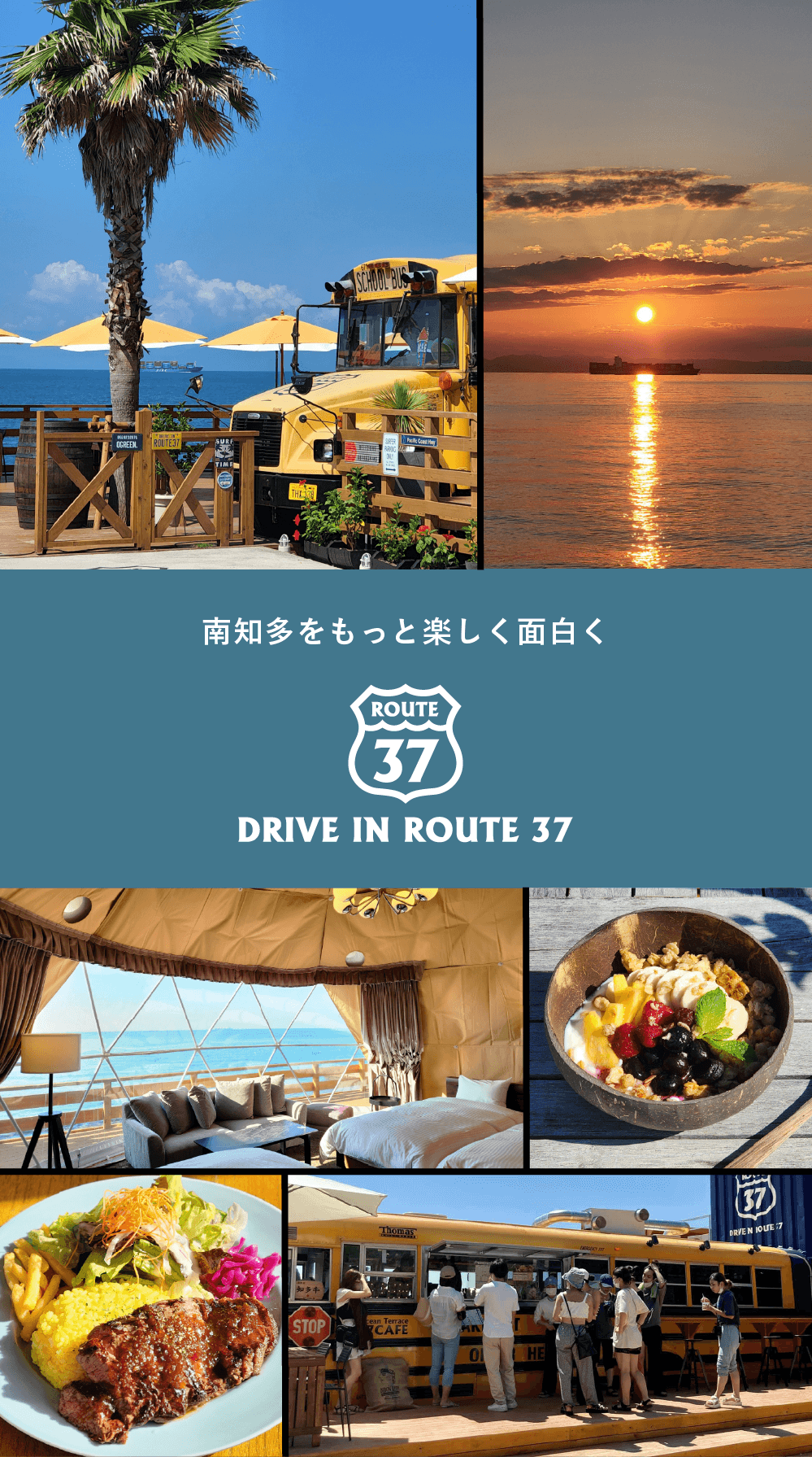 生まれ故郷の南知多。ひと昔前は観光客で賑わいを見せ週末になると町内は渋滞するほどでしたが、その面影や訪れる人は年々減少していきました。南知多には恵まれた沢山の資源や素敵な場所が多く存在します。「いつか地元に貢献したい」という想いはずっとありましたが、サーフィンやツーリングなどで地元に足を運ぶ度にその想いは増していきました。私達に出来る事で、こんなスポットがあったらいいを形にしたのがDRIVE IN ROUTE37です。『37』は南知多町のマスコット、ミーナちゃんと、みんなが笑顔になれる場所という想いを込めました。『南知多をもっと楽しく面白く』このビジョンを訪れてくださる皆様と共に育んでいけたら嬉しく思います